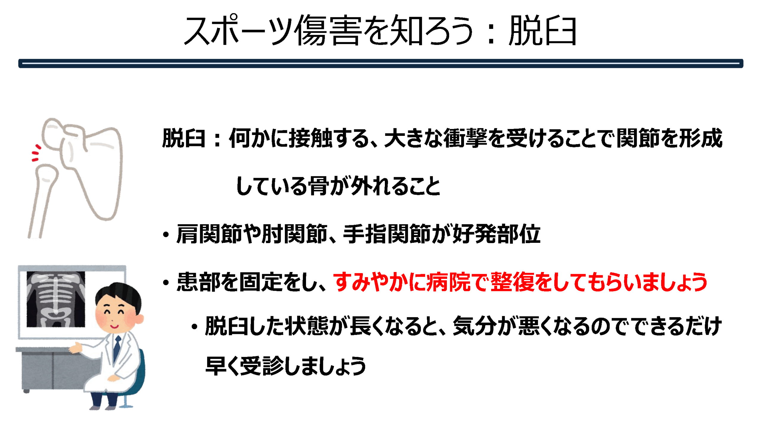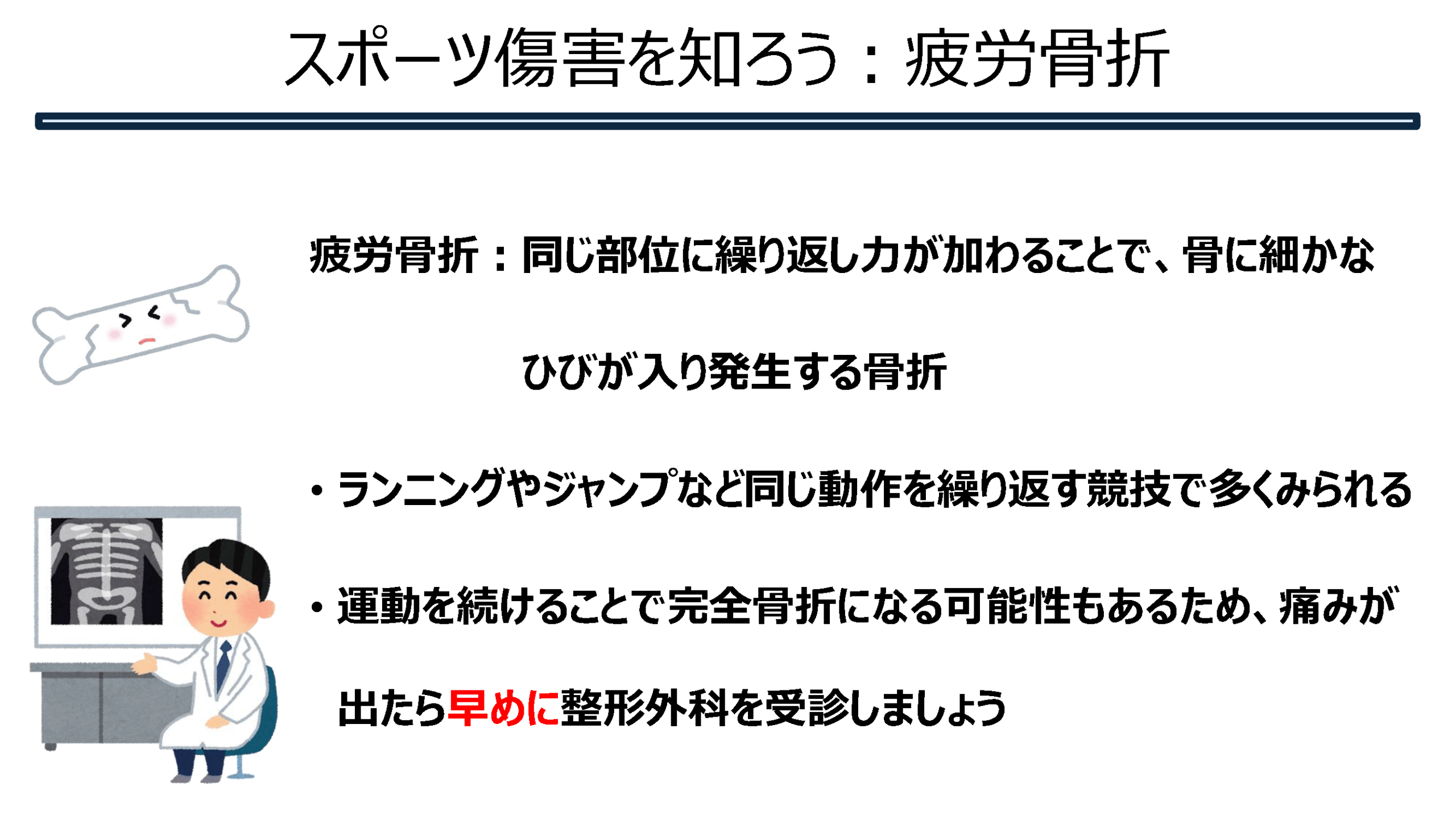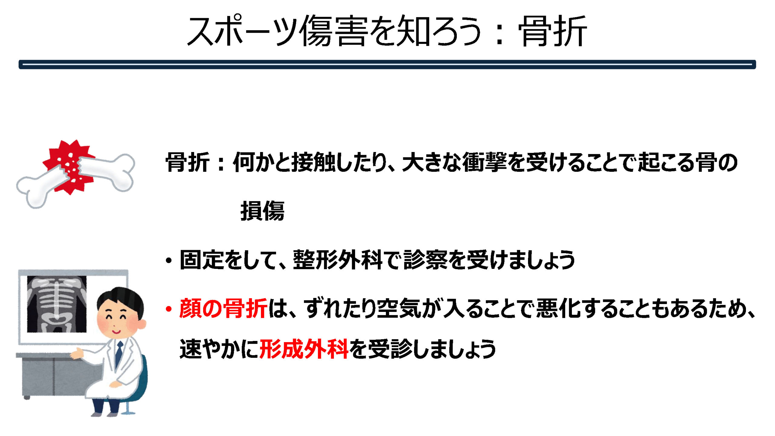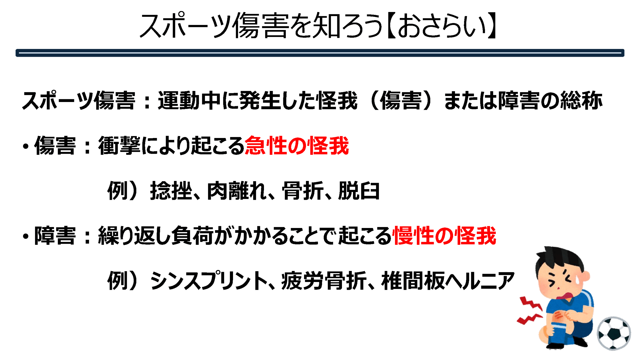 スポーツ傷害を知ろう②(骨系) 2025.08.18 骨系のスポーツ傷害についてまとめてみました。 Tweet Share Hatena Pocket RSS feedly Pin it スポーツ傷害を知ろう①(筋腱編) 前の記事 スポーツ傷害を知ろう③(脳震盪) 次の記事