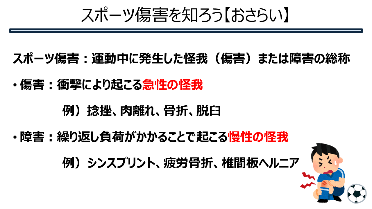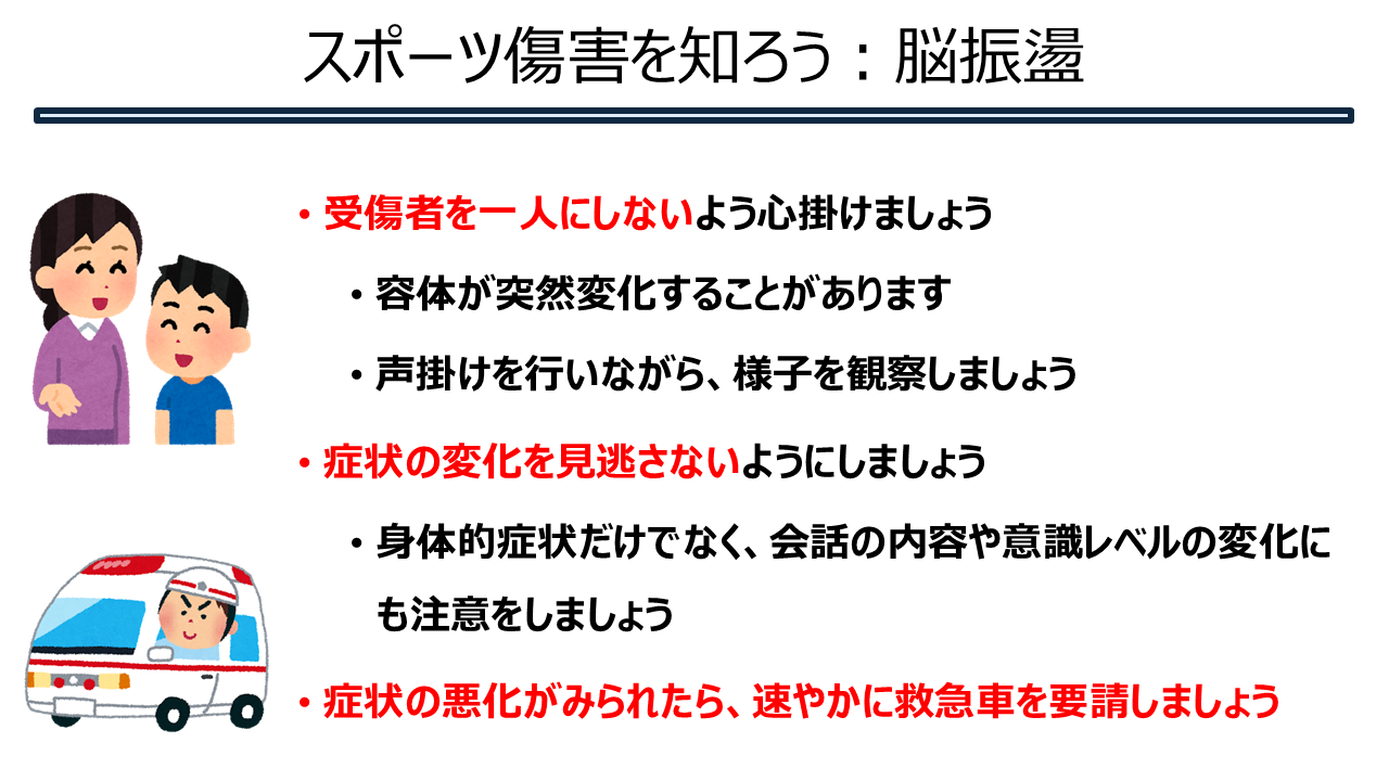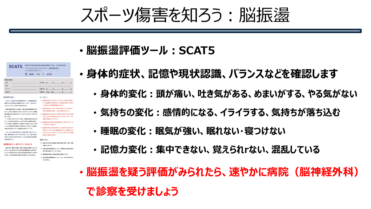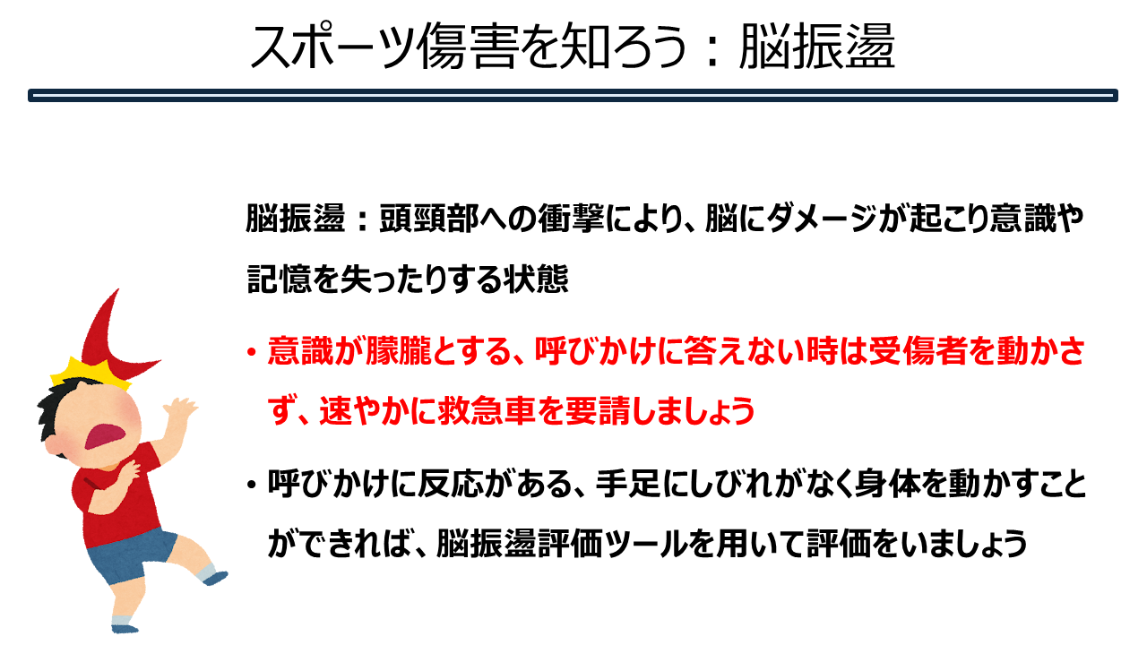 スポーツ傷害を知ろう③(脳震盪) 2025.09.1 スポーツ傷害を知ろう!第三回目は、脳震盪についてです。 目でみてすぐに分かる部分ではなく、時間をかけて徐々に症状が出てきたり悪化する恐れがあり、命に関わるケガです。 選手の命を守るために対応を確認しましょう。 Tweet Share Hatena Pocket RSS feedly Pin it スポーツ傷害を知ろう②(骨系) 前の記事 傷の手当 次の記事